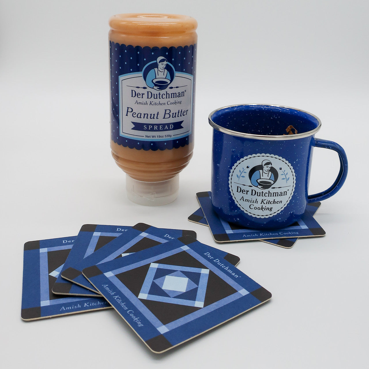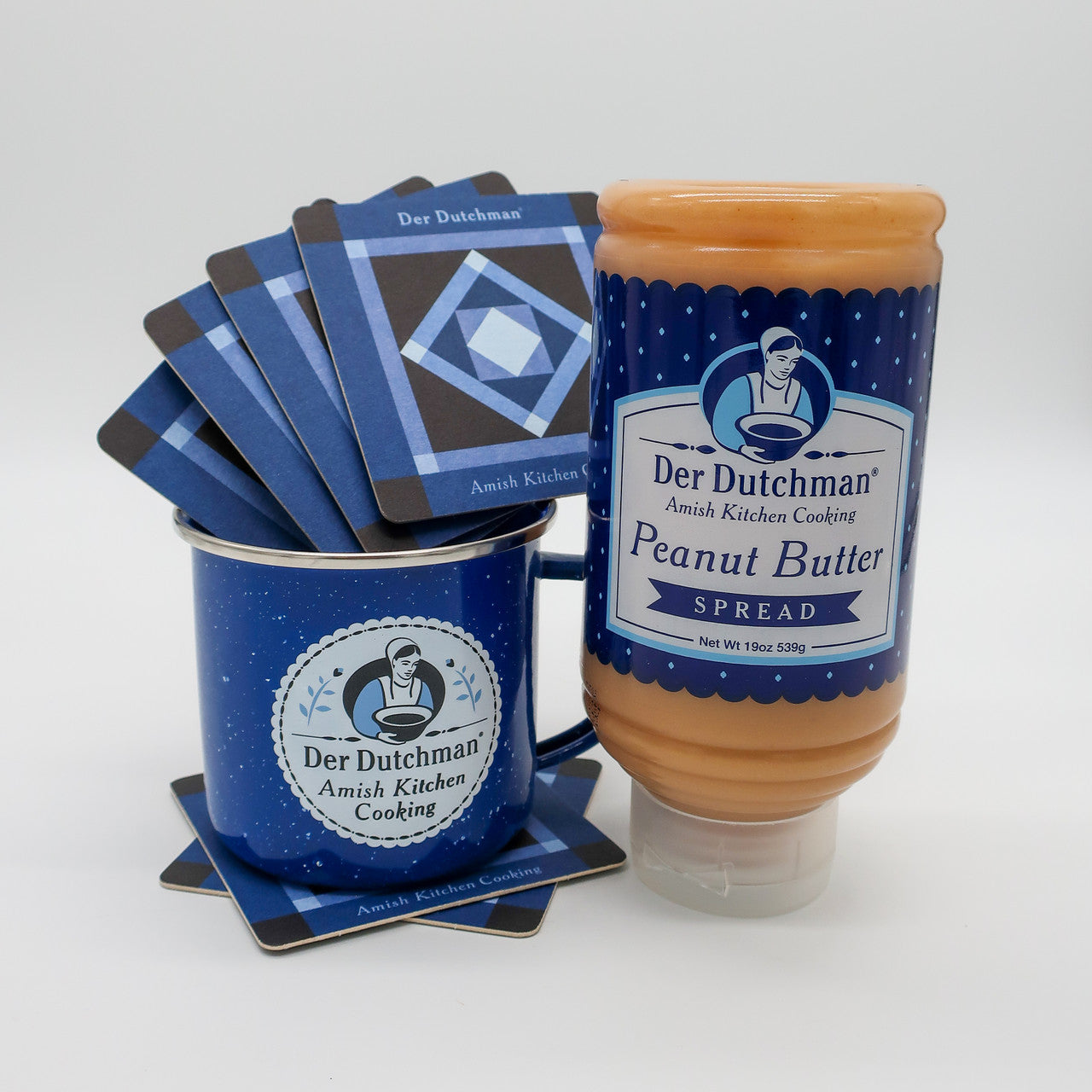 Dutch Valley mug, 19 oz Peanut Butter Spread, and six coasters.